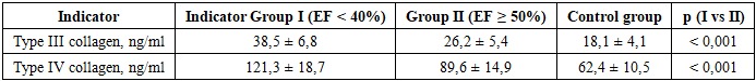 Analysis of laboratory and instrumental indicators revealed significant differences between patients with reduced ejection fraction (EF <40%) and preserved ejection fraction (EF ≥50%), as well as in comparison with the control group. In patients of group I, a significant increase in the level of NT-proBNP (5647±932 pg/ml) was noted, which significantly exceeded the values of group II (2380±721 pg/ml) and control group (118±45 pg/ml; p<0.001), reflecting a more pronounced degree of hemodynamic overload and severity of SLE.Kidney function indicators also had adverse changes in patients with reduced blood pressure: creatinine levels were significantly higher in group I compared to group II and control (115.6±18.4 versus 99.3±14.7 and 84.7±12.1 μmol/l; p<0.01), while glomerular filtration rate significantly decreased (61.2±9.8 ml/min/1.73 m2), indicating the formation of cardiorenal syndrome. In group II, CHF indicators were intermediate and significantly differed from the control values (p<0.001).From the protein metabolism side, in patients with BP <40%, a significant decrease in total blood protein (66.5±4.9 g/l) was revealed compared to the II group (69.4±5.1 g/l) and the control group (73.2±4.7 g/l; p<0.05), which may reflect the influence of chronic venous congestion, impaired synthetic liver function, and systemic inflammation.Carbohydrate and lipid metabolism indicators (glucose and total cholesterol levels) did not differ statistically significantly between the groups (p>0.05), although a tendency towards higher glucose values was noted in group I, which may indicate metabolic tension against a background of severe CHF.To assess the severity of liver fibrotic changes in patients with chronic heart failure depending on the left ventricular ejection fraction, serum levels of type III and IV collagen, reflecting the activity of fibrogenesis and remodeling of the extracellular matrix, were analyzed (table 2).Table 2. Examination of type III and IV collagen levels, (M ± SD)  |