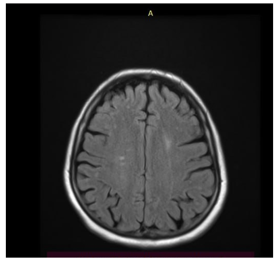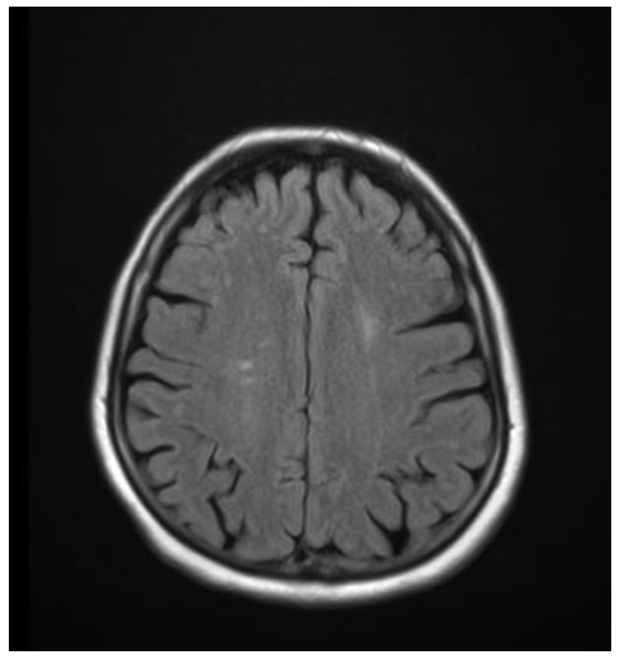 To objectively characterize brain damage in pregnant women with severe preeclampsia, magnetic resonance imaging (MRI) was performed using FSE_T2_FLAIR, T1_FLAIR, and DWI modes. The study was performed on axial, coronal, and sagittal sections with a 5-mm slice thickness.Brain MRIs (Figs. 1, 2) reveal areas of hyperintensity on FLAIR sequences, predominantly in the occipito-parietal regions of the white matter, with a tendency toward symmetrical distribution. These changes are characterized by vasogenic edema without signs of mass effect, midline displacement, hemorrhage, or ischemic injury. | Figure 1. MRI of the brain of patient Z.T., with severe preeclampsia (axial slice, FSE_T2_FLAIR mode): hyperintense foci of vasogenic edema in the occipital-parietal regions |