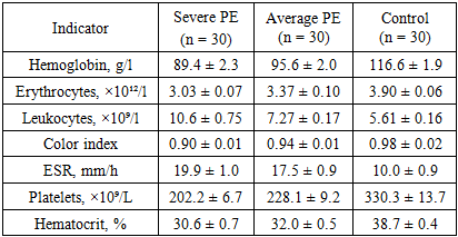 The ventricular system is not dilated, the contours are clear, and the subarachnoid spaces are not deformed. On FSE_T2 and T1 FLAIR sections, the structure of the corpus callosum and brainstem is preserved, and no signs of focal necrotic changes are detected. Dynamic observation 10-14 days after delivery showed regression of foci of hyperintensity, confirming the reversible nature of the process.The obtained data indicate the presence of typical MRI signs of reversible posterior encephalopathy syndrome (Posterior Reversible Encephalopathy Preeclampsia Retinopathy Syndrome (PRES) occurs in patients with severe preeclampsia. This syndrome develops as a result of hypertensive crisis, endothelial dysfunction, and impaired cerebral blood flow autoregulation, leading to increased permeability of the blood-brain barrier and the development of vasogenic edema.Visualized areas of hyperintensity in the white matter of the parieto-occipital lobes reflect reversible perfusion disturbances. The absence of signs of cytotoxic edema and necrosis confirms the benign nature of the process, provided blood pressure is corrected promptly and delivery is performed.Correlation analysis showed a significant relationship between the severity of hyperintensive changes and hemodynamic parameters (r = 0.62; p < 0.01) and coagulation status (r = 0.58; p < 0.05), which reflects the systemic nature of vascular disorders in severe preeclampsia.Table 1 presents the data of the general blood test in pregnant women with severe (group 1a) and moderate (group 1b) preeclampsia compared to the control group.Table 1. Main indicators of general blood analysis in examined pregnant women (M ± m)  |