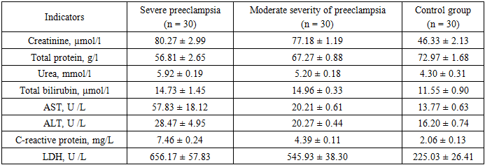 The total protein level in this category of patients was significantly reduced (56.8 ± 2.6 g/L versus 72.9 ± 1.6 g/L in the control, p < 0.01), reflecting hypoproteinemia resulting from increased vascular permeability, urinary protein loss, and activation of the inflammatory response. In the moderate-severity group, the protein level was 67.3 ± 0.9 g/L, which was also lower than the control values, but the difference was less pronounced (p < 0.05).Bilirubin in patients with severe preeclampsia reached 14.7 ± 1.5 μmol/L, while in the control group this indicator was 11.5 ± 0.9 μmol/L, indicating the initial signs of cytolysis and possible liver involvement in the pathological process. Elevated levels of liver enzymes - AST (57.8 ± 18.1 U /L) and ALT (28.5 ± 4.9 U /L) - indicate the development of cytolysis syndrome and hypoxic damage to hepatocytes. In the moderate group, these enzymes had lower values (AST = 20.2 ± 0.6 U /L, ALT = 20.3 ± 0.4 U /L), indicating a lesser degree of liver dysfunction, corresponding to a more favorable course of the disease.Of particular importance is the C-reactive protein level, which in pregnant women with severe preeclampsia was 7.46 ± 0.24 mg/L, which is 3.6 times higher than the control group (2.06 ± 0.13 mg/L, p < 0.001). This reflects a pronounced inflammatory response and endothelial activation. In patients with moderate preeclampsia, the CRP value was moderately elevated—4.39 ± 0.10 mg/L, which is consistent with the clinical manifestations of moderate hypertension and the absence of severe multiorgan damage.Lactate dehydrogenase (LDH) concentration in the severe form reached 656.1 ± 57.8 U /L, which is almost three times higher than the control values (225.0 ± 26.4 U /L, p < 0.001) and indicates severe tissue hypoxia and damage to cell membranes. In the moderate group, the LDH level was 545.9 ± 38.3 U /L, remaining significantly above the norm, indicating a persistent subclinical level of cytolysis.Overall, the obtained results demonstrate that severe preeclampsia is characterized by a combination of hypoproteinemia, hyperenzymemia, increasing azotemia, and a pronounced inflammatory response. Correlation analysis revealed a direct relationship between CRP levels and LDH values (r = 0.72, p < 0.01), as well as an inverse relationship between total protein concentration and the severity of cerebral changes according to MRI data (r = –0.58, p < 0.05), indicating a pathogenetic relationship between systemic inflammation, hemostatic disorders, and central nervous system damage in severe preeclampsia.