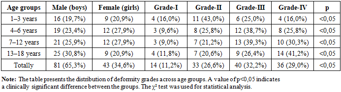 This study is based on the diagnostic and treatment outcomes of 124 pediatric patients with congenital pectus excavatum who were managed at the Department of General and Thoracic Surgery of the Andijan Regional Children’s Multidisciplinary Medical Center - the clinical base of Andijan State Medical Institute during the years 2020–2024. To evaluate the effectiveness of treatment methods, the patients were divided into two groups: a main group consisting of 90 children (72,5%) and a control group comprising 34 children (27,5%). Among the 90 patients in the main group, 14 children (15,6%) with grade I deformity were managed conservatively through supervised orthopedic physical exercises. No indications for surgical intervention were identified in these patients. Of the remaining 76 patients (84,6%) with more advanced deformity grades, 18 children (20,0%) underwent conservative treatment using the Vacuum Bell therapy method, while 58 children (64,4%) received surgical correction - with or without the use of internal fixation devices.Methods of Age Grouping and Severity Assessment. In classifying patients by age groups, we applied the “Standardized Age Groups” recommended by the World Health Organization (WHO), which represent the most widely used international age classification system today. The severity of pectus excavatum was assessed using the Haller-like Pectus Carinatum Index (HPCI, 2021). According to this index, deformity severity was categorized as follows: Grade I – mild deformity: PCI=1,00–1,05, Grade II – moderate deformity: PCI=1,06–1,20, Grade III – severe deformity: PCI=1,21–1,35, Grade IV – very severe, rigid deformity: PCI≥1,35. The distribution of patients by age groups and severity grades is presented below (Table 1).Table 1. Distribution of Children With Pectus Excavatum According to Age Group and Deformity Severity  |