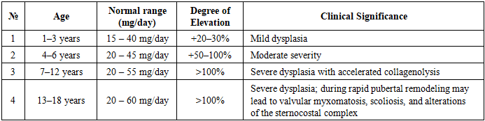 Collagen metabolism in the body varies with age. In children, due to the high activity of bone and connective tissue remodeling, the daily normative range of oxyproline is observed across a broader interval compared with adults. Hormonal changes during the pubertal period, the acceleration of skeletal growth, and increased physical activity contribute to physiological fluctuations in oxyproline levels.In children aged 1–3 years, the normal daily oxyproline level ranges from approximately 15–40 mg/day, and the biochemical changes observed during this period are primarily associated with physiological growth. Values exceeding the norm by 20–30% are characteristic of mild dysplasia, where tissue alterations are minimal. In children aged 4–6 years, the normal range is 20–45 mg/day. During this stage, a 50–100% increase in daily oxyproline indicates a markedly accelerated rate of collagenolysis and corresponds to clinical and biochemical manifestations of moderate dysplasia.In such children, signs including joint hypermobility, skin laxity, and weakness of the sternocostal complex are more commonly observed. In the 7–12-year age group, the normal daily oxyproline level ranges from 20–55 mg/day, and a rise of 100% or more is regarded as an indicator of severe dysplasia. Rapid collagen degradation may lead to systemic skeletal deformities and myxomatous changes in the cardiac valves. For this reason, orthopedic, cardiological, and biochemical monitoring intervals are shortened in these patients.In teenagers aged 13–18 years, the normal daily oxyproline range is 20–60 mg/day. Due to hormonal changes during puberty and remodeling processes occurring in the growth plates, an increase in oxyproline levels by 100% or more indicates a high-risk stage of connective tissue dysplasia. These teenagers may show rapid progression of scoliosis, thoracic deformities (pectus excavatum), and a higher frequency of mitral valve prolapse.When the daily urinary oxyproline levels were examined in 79 patients from the main study group, the following deviation indicators were observed according to the severity grades of pectus excavatum (Table 3).Table 3. Deviation of Daily Urinary Oxyproline Levels According to Deformity Severity in Children With Pectus Excavatum  |