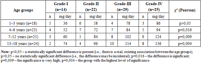 Table 3 presents the severity grades of connective tissue dysplasia (CTD) across different age groups in children and the corresponding dynamics of oxyproline excretion in urine. As the data show, the concentration of oxyproline increases consistently and steadily in parallel with increasing deformity severity. In children aged 1–3 years, the number of cases with grade I and grade II dysplasia is relatively high, and oxyproline levels are recorded at comparatively low values (36–58 mg/day). In patients with grade III and grade IV dysplasia, this indicator rises to 78–86 mg/day. These differences observed at this age are explained by the early manifestations of dysplasia and the relatively low activity of tissue degradation processes. In the 4–6-year age group, dysplasia severity begins to increase markedly. Oxyproline levels, which range from 52–72 mg/day in grades I–II, rise to 84–94 mg/day in grades III–IV. In this age interval, accelerated collagenolysis is observed as a result of intensified skeletal and connective tissue growth and the activation of endogenous developmental factors.In children aged 7–12 years, oxyproline levels increase even further: 60–84 mg/day in grades I–II, and 102–124 mg/day in grades III–IV. This period corresponds to one of the most rapid phases of organ and skeletal system growth in children; therefore, biochemical markers of dysplasia appear with a pronounced elevation.The highest values were recorded in the 13–18-year group. Specifically, oxyproline levels reached 74 mg/day in grade I and up to 136 mg/day in patients with grade IV dysplasia.Hormonal changes during the teenage years, the rapid growth of the musculoskeletal system, and the structural fragility of connective tissue contribute to the progression of dysplasia and a further increase in oxyproline levels. According to the χ² (Pearson) analysis, age-related changes in oxyproline levels in connective tissue dysplasia become statistically significant beginning from the age of 4 years (p<0.05).In the 7–12 and 13–18 age groups, the highly significant p-values of 0.009 and 0.004 indicate a strong correlation between increasing dysplasia severity and elevated daily oxyproline levels. This confirms the scientific validity of using oxyproline as a sensitive biomarker for assessing the severity of pectus excavatum.Overall, the data presented in the table clearly demonstrate the role of collagen degradation in the pathogenesis of pectus excavatum. The gradual increase in oxyproline levels with advancing age and worsening dysplasia severity confirms its value as a clinically and prognostically significant biomarker. Using this biomarker allows for more accurate and reliable assessment of dysplasia severity, monitoring of disease dynamics, and selection of appropriate treatment strategies.An increase in the daily amount of oxyproline in urine above the age-related normal range serves as a biochemical indicator of collagen degradation in connective tissue dysplasia. A 20–30% elevation is observed in mild dysplasia, while a 50–100% increase is considered indicative of moderate dysplasia. When the level rises by 100% or more, severe forms of tissue dysplasia, accelerated collagenolysis, and a high risk of visceral pathologies are likely.In addition, the rapid variability of values during the teenage years is associated with hormonal and mechanical factors and requires regular biochemical monitoring. The dynamics of oxyproline levels serve as an important clinical criterion for evaluating therapeutic effectiveness, predicting outcomes, and determining the intervals for follow-up surveillance.