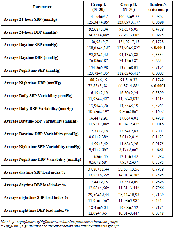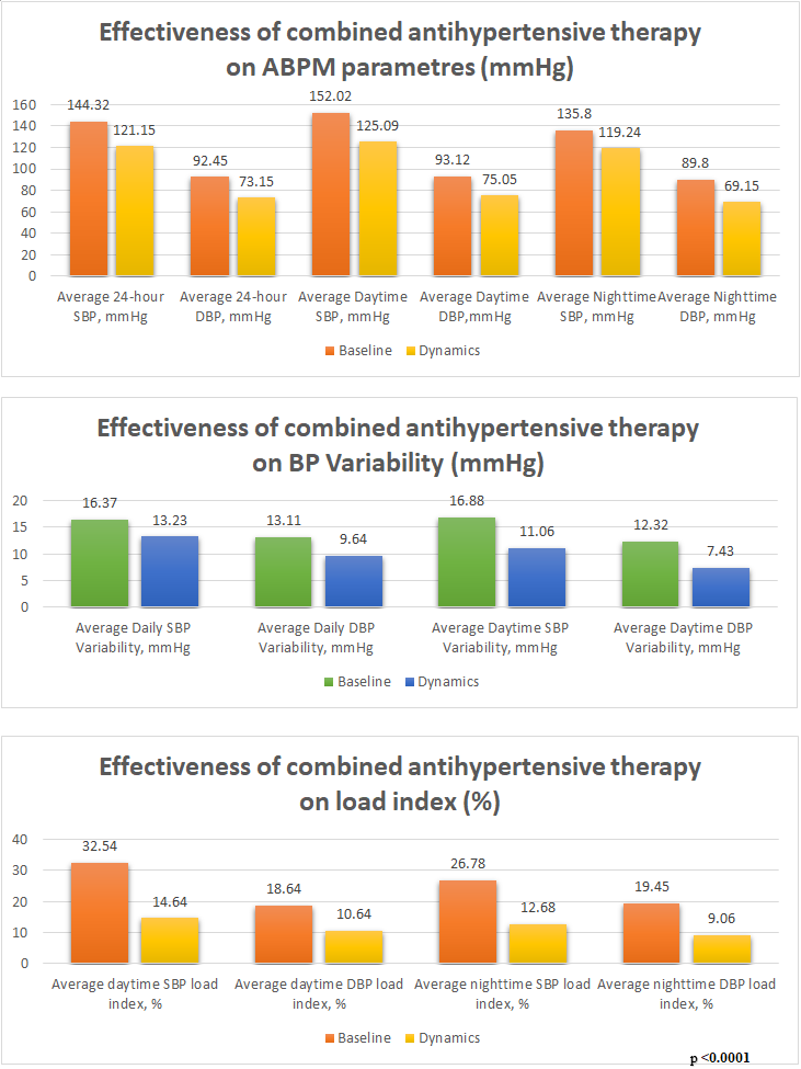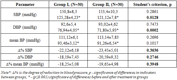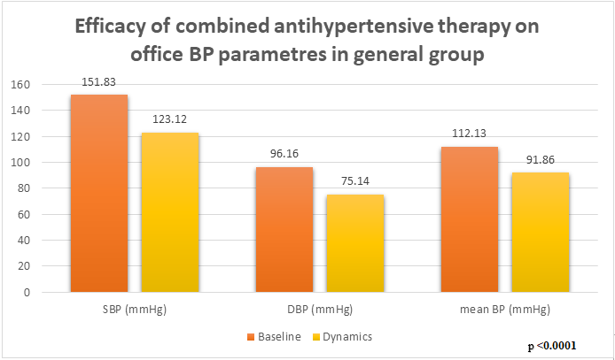 Analysis of office blood pressure parameters in both groups demonstrated a positive antihypertensive effect in achieving target BP levels, regardless of the chosen drug regimen (Pic 1). Significant reductions in systolic, diastolic, and mean blood pressure were observed (p=0.0001). This means that patients demonstrated good tolerability of this therapy. | Picture 1 |