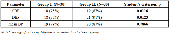 Target SBP levels were achieved in 75% of patients in the first group and in 87% of patients in the second group (χ2=0.98 p=0.32), target DBP levels were recorded in 75% and 91% of patients, respectively (χ2=2.02 p=0.15), but no statistically significant difference was found between the groups (Table 3).Table 3. Comparison in achieving target blood pressure levels  |
