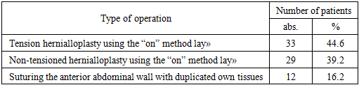 Patients in the first comparison group underwent hernioplasty using local tissues and hernioplasty using a polypropylene prosthesis.According to the indications, combined interventions were performed: cholecystectomy, hernioplasty Inguinal hernia. In 19 (35.2%) patients, omental resection was performed due to severe adhesions, viscerolysis, to prevent adhesive intestinal obstruction, and to reduce the volume of the abdominal cavity to prevent increased intra-abdominal pressure.In patients in the comparison group, hernioplasty was performed using tension and non-tension methods, both local tissues and polypropylene implants (Table 1).Table 1. Type of hernioplasty in patients in the comparison group  |