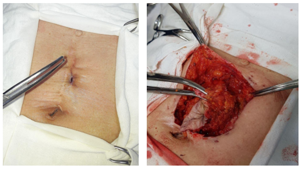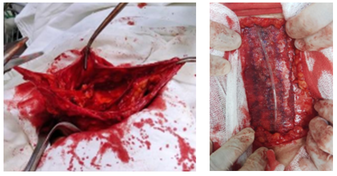 When a patient had a postoperative hernia, excision of the postoperative scar with altered subcutaneous fat was always performed. This eliminates foci of "dormant" infection (ligature fistulas, ligatures). Furthermore, scar- affected tissues typically revascularize poorly, preventing the creation of a sufficiently mechanically strong postoperative scar (Fig. 1). | Figure 1. Excision of a postoperative scar with altered subcutaneous fat |