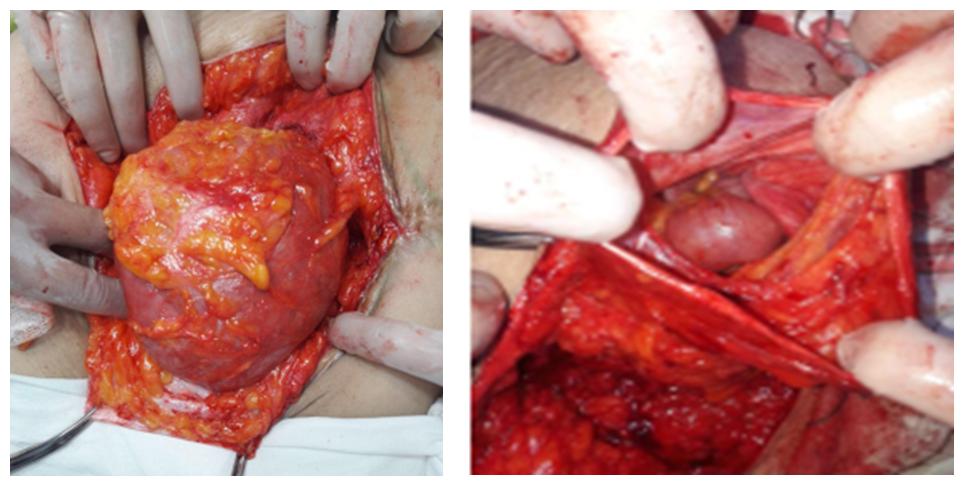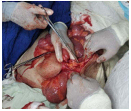 The hernial sac was opened along the midline, maintaining its connection with the edges of the rectus abdominis sheaths on both sides. The abdominal organs were then inspected and adhesions were separated (Fig. 3). | Figure 3. Separation of adhesions between the hernial sac and contents |