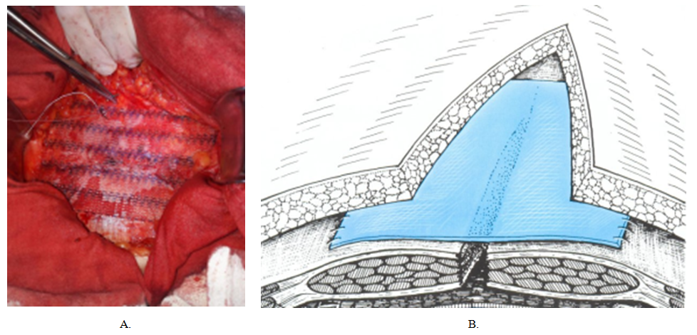 When implanting an "onlay" endoprosthesis with suturing of the hernia defect, the hernia orifice was strengthened by suturing a graft over the autograft. The edges of the hernia defect were sutured with interrupted sutures until tight contact was achieved or duplicated. The anterior surface of the muscular-aponeurotic layer was then separated from the subcutaneous tissue for 8-10 cm from the suture line in both directions, and the graft was sutured over the aponeurosis with interrupted sutures (Fig. 4). | Figure 4. a. Placement of the explant in front of the muscular-aponeurotic layer, b. Schematic representation according to V.V. Zhebrovsky, F.N. Ilchenko, 2004 |