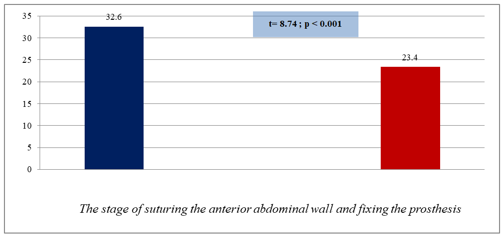 Thus, by rationally selecting a surgical approach for the treatment of postoperative ventral hernias, as well as by using a modified hernioalloplasty technique, we were able to simplify the surgical technique and mitigate the technical difficulties encountered during suturing the anterior abdominal wall and fixing the synthetic implant. This significantly reduced the duration of this stage of the surgery from 32.6 ± 0.5 to 23.4 ± 0.7 minutes (P < 0.001), demonstrating the high efficacy of the proposed method (Fig. 7). | Figure 7. Time period for suturing the anterior abdominal wall and fixing the prosthesis using modernized technical aspects |