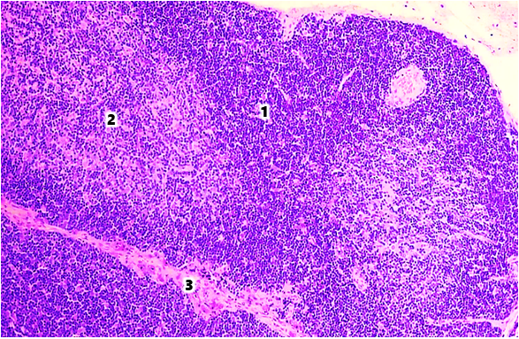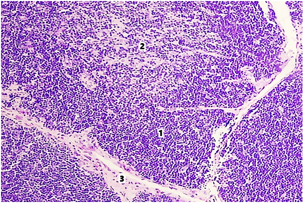 The thymus of laboratory animals of the control group consists of two interconnected lobes, located in the lower third of the sternum mesentery. The thickness of the capsule in the area of the thymus gate in healthy white outbred rats at 6 and 9 months of age was 5.82±0.32 and 5.97±0.38 μm, respectively. The diameter of the trabecula in the proximal part was 13.36±0.27 and 13.52±0.22 μm, respectively, and in the distal part 10.28±0.14 and 10.43±0.22 μm. The area of the thymus lobules was 64.27±0.12% and 52.27±0.48%, respectively, by age periods.The thickness of the capsule in the thymus gate area of white outbred rats in the group with modeled selenium deficiency increased by 6.87% at 6 months of age and 7.54% at 9 months of age compared to the indicators of white rats in the control group. It was established that the diameter of the proximal and distal parts of the trabecula increases by 1.05 and 1.06 times, respectively, in both age periods. The area of the thymus lobules decreased by 6.1% at 6 months of age, by 7.0% at 9 months of age, and amounted to 60.57±0.32% and 48.83±0.26%, respectively.In the histological preparations of the tissues of the thymus of healthy white outbred rats, the cortical and medullary layers are distinguished. The boundary between the cortical and medullary layers is not clearly defined. Fragments with parenchyma replaced by adipose tissue are identified. In 6- and 9-month-old laboratory animals of the control group, the area of the cortical layer of the thymus was 63.86±0.37% and 58.83±0.26%, respectively, and the area of the medullary layer was 28.52±0.38% and 32.92±0.42%, respectively (Fig. 1). | Figure 1. Thymus of a 9-month-old white rat in the control group. Stained with hematoxylin-eosin. Ok. 10 x vol. 10. 1st cortex, 2nd medulla, 3rd trabecula |