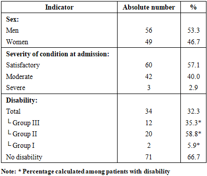 Analysis of age characteristics showed that the mean age of women was 53.5 ± 2.6 years, while that of men was 46.05 ± 3.2 years. In the overall structure of the examined patients, men predominated – 56 (53.3%), while women accounted for 49 (46.7%). According to the severity of the condition at admission, patients were distributed as follows: 60 (57.1%) patients were admitted in a satisfactory condition, 42 (40.0%) in a moderate condition, and 3 (2.9%) in a severe condition. Disability due to hepatopancreatoduodenal system pathology was observed in 34 (32.3%) patients. Among them, disability group III was established in 12 (35.3%), group II in 20 (58.8%), and group I in 2 (5.9%) patients. In 71 (66.7%) patients, disability was not registered (Table 1).Table 1. Socio-demographic and clinical characteristics of patients (n = 105)  |
