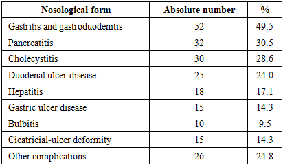 The disease structure included gastritis and gastroduodenitis in 52 (49.5%) cases, pancreatitis in 32 (30.5%), cholecystitis in 30 (28.6%), duodenal ulcer disease in 25 (24.0%), hepatitis in 18 (17.1%), and gastric ulcer disease in 15 (14.3%). Bulbitis was identified in 10 (9.5%) patients. Cicatricial-ulcer deformity was diagnosed in 15 (14.3%) patients, while other complications were observed in 26 (24.8%) cases (Table 2).Table 2. Structure of hepatopancreatoduodenal system diseases  |