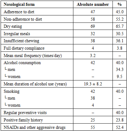 The most prevalent risk factors in descending order were: dry eating habits (65.7%), psycho-emotional stress (57.1%), non-adherence to diet (55.2%), NSAID use (52.4%), smoking (40%), and alcohol consumption (40%).