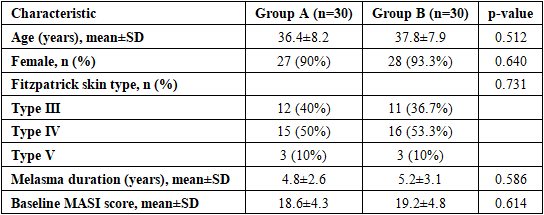 Baseline Characteristics. Sixty patients completed the study (30 per group). Baseline characteristics are presented in Table 1. No statistically significant differences were observed between groups regarding age, gender, skin type, Melasma duration, or baseline MASI scores (all p>0.05), indicating adequate comparability despite non-randomized allocation.Table 1. Baseline Demographics and Clinical Characteristics  |