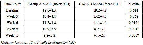 Primary Outcome: MASI Score Reduction.Both groups demonstrated significant improvement in MASI scores from baseline to 12 weeks post-treatment. Group B (combination therapy) showed superior outcomes compared to Group A (monotherapy).Within-group analysis:- Group A: Baseline MASI 18.6±4.3 → 8.8±3.2 at week 12 (52.7% reduction, p<0.001)- Group B: Baseline MASI 19.2±4.8 → 6.1±2.7 at week 12 (68.4% reduction, p<0.001)Between-group analysis:The difference in MASI reduction between groups was statistically significant (mean difference 15.7%, 95% CI: 6.2-25.2%, p=0.003, Cohen's d=0.82), indicating a large effect size favoring combination therapy.Table 2. MASI Score Changes Over Time  |