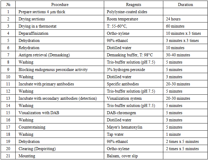 This study was based on a retrospective descriptive analysis of immunohistochemical findings in patients with non-small cell lung cancer (NSCLC). A total of 60 patients with histologically confirmed NSCLC were included in the study. Tumor tissue samples were obtained during diagnostic biopsy or surgical interventions and subsequently subjected to pathological and immunohistochemical examination. All cases were examined under the conditions of the Navoi region, and the diagnosis of lung cancer was verified according to standard histopathological criteria.Histological classification of tumor specimens was performed in accordance with the World Health Organization (WHO) classification of lung tumors. The study cohort comprised three major histological subtypes of NSCLC, each represented by 20 cases: squamous cell carcinoma of the lung, lung adenocarcinoma, and large cell carcinoma of the lung. Such distribution enabled a comparative assessment of immunohistochemical marker expression among different histological variants of NSCLC.Immunohistochemical analysis was carried out on formalin-fixed, paraffin-embedded tissue blocks. Sections 4 μm thick were prepared from paraffin blocks, mounted on poly-L-lysine-coated glass slides, and dried at room temperature for 24 hours, followed by additional drying in a thermostat at 55–60°C for 60 minutes. Deparaffinization was performed using ortho-xylene, after which the sections were rehydrated through graded ethanol solutions. Antigen retrieval was achieved using a demasking buffer in water heated to 98°C for 30–40 minutes. Endogenous peroxidase activity was blocked with a 3% hydrogen peroxide solution.Immunohistochemical staining was performed using an automated immunohistochemical processor Bond™ (Leica, Australia). Monoclonal antibodies against p53, CD34, and programmed death-ligand 1 (PD-L1) were applied in accordance with the manufacturer’s recommendations. Visualization of antigen–antibody reactions was achieved using a diaminobenzidine (DAB) chromogen system, followed by counterstaining with Mayer’s hematoxylin. After staining, the sections were dehydrated, cleared, and mounted for microscopic evaluation.Evaluation of p53 and PD-L1 expression was carried out using the semi-quantitative ALLRED scoring system, which is based on the proportion of positively stained tumor cells. The results were categorized as negative (0 points), weak positive reaction with less than 30% of positive cells (1 point), moderate positive reaction with 30–60% positivity (2 points), and strong positive reaction with more than 60% of positive tumor cells (3 points). CD34 expression was assessed by identifying endothelial cell staining and was used to estimate tumor microvessel density. The number of stained microvessels was evaluated in representative high-power fields (objective ×10, ocular ×40), allowing assessment of angiogenic activity within the tumor microenvironment.The immunohistochemical data obtained were analyzed using descriptive statistical methods. The distribution and frequency of marker expression levels were calculated for each histological subtype of NSCLC and expressed as absolute values and percentages. Comparative analysis was performed to identify differences in the expression patterns of p53, CD34, and PD-L1 among squamous cell carcinoma, adenocarcinoma, and large cell carcinoma of the lung. The stages of the immunohistochemical study are summarized in Table 1.Table 1. Stages of immunohistochemical (IHC) examination  |