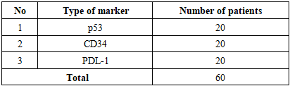 In our study, immunohistochemical examination was performed in 60 patients. The expression of the p53 tumor suppressor gene, the CD34 marker, and the PD-L1 marker was evaluated, with each marker being analyzed in 20 patients.Table 2. The following markers were selected for immunohistochemical analysis  |