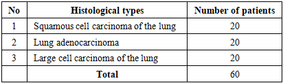This investigation is of great importance for identifying molecular structures at the cellular level, studying cellular localization, assessing tumor spread and histogenesis, monitoring the development of precancerous processes, determining prognostically significant complications, defining tumor stage and treatment strategy, enabling dynamic follow-up and control of therapeutic interventions, and identifying risk groups predisposed to the development of malignant neoplasms.Table 3. Histological types of non-small cell lung cancer  |