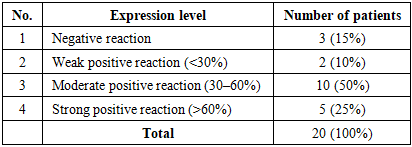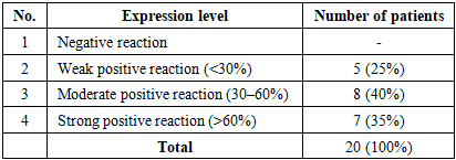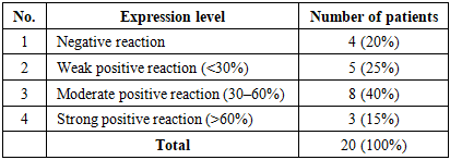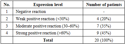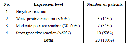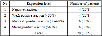 Immunohistochemical examination was performed in the following histological types of lung cancer: squamous cell carcinoma of the lung in 20 patients, lung adenocarcinoma in 20 patients, and large cell carcinoma of the lung in 20 patients. In patients with non-small cell (squamous cell) lung cancer, the levels of p53 marker expression (high, moderate, and weak) were evaluated. The obtained results were assessed using the ALLRED scoring system, which takes into account the percentage of positively stained tumor cells and the intensity of receptor staining. These parameters were subsequently combined to yield a semi-quantitative score ranging from 1 to 3. The minimum score was defined as 0 (negative), while scores of 1, 2, and 3 corresponded to weak positive reaction (10–30%), moderate positive reaction (30–60%), and strong positive reaction (60–100%), respectively.In this analysis, among 20 patients, weak positive p53 expression was observed in 4 cases (20%), moderate positive expression in 6 cases (30%), strong positive expression in 6 cases (30%), and negative expression in 4 cases (20%) (Table 4).Table 4. p53 expression levels in non-small cell (squamous cell) lung cancer  |