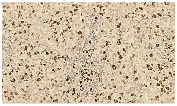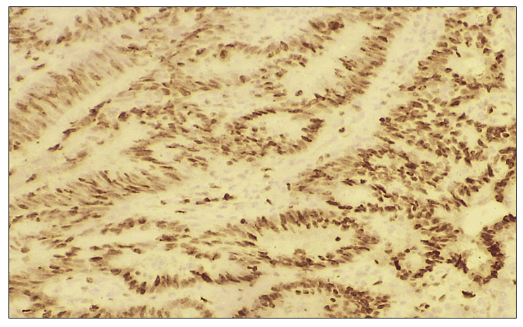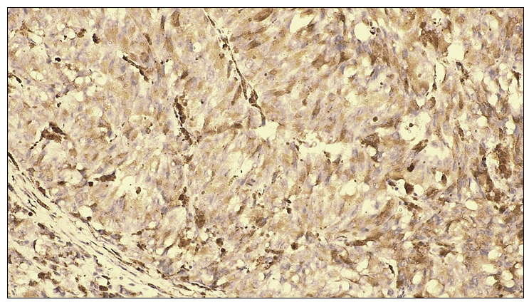 On microscopic examination, tumor cells with large-cell epithelial differentiation exhibited marked polymorphism, hyperchromatic nuclei, and numerous pathological mitotic figures. The epithelial stroma contained angiomatous blood vessels and loose fibrous connective tissue. The tumor cell nuclei demonstrated a strong positive reaction with intense dark-brown staining. | Figure 7. Moderate positive p53 immunohistochemical reaction in large cell carcinoma of the lung. IHC, DAB chromogen. Objective ×10, ocular ×40 |