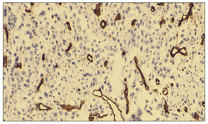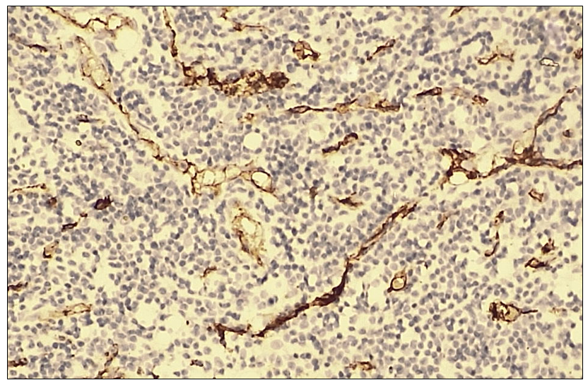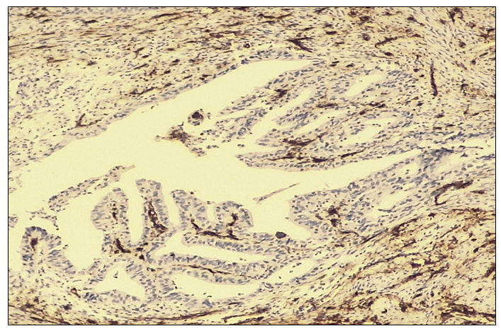 In all 20 selected patients with non-small cell lung adenocarcinoma, CD34 expression was evaluated to assess tumor vascularity and its association with metastatic potential. A 100% positive reaction was observed in all cases, characterized by distinct staining of endothelial cells lining the vessel walls. This finding facilitated the assessment of microvessel density in the present study, with a clearly visible number of blood vessels per high-power field (objective ×10, ocular ×40). The pronounced vascularization of the tumor tissue indicates a high angiogenic activity, suggesting an increased potential for tumor metastasis.Microscopically, tumor cells with glandular epithelial differentiation exhibited marked polymorphism, hyperchromatic nuclei, and numerous pathological mitotic figures. The epithelial stroma contained angiomatous blood vessels with intensely dark-brown–stained walls. A high microvessel density, ranging from 30–40 or more blood vessels per field of view, was identified. | Figure 5. Negative CD34 immunohistochemical reaction in non-small cell lung adenocarcinoma. IHC, DAB chromogen. Objective ×10, ocular ×40 |