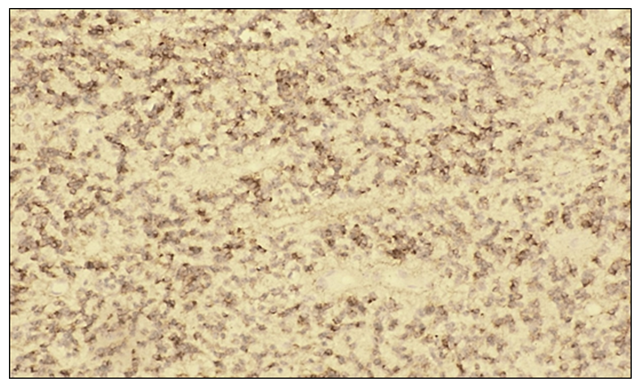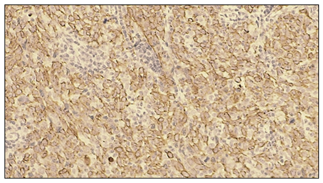 On microscopic examination, tumor cells with large-cell epithelial differentiation demonstrated marked polymorphism, hyperchromatic nuclei, and numerous pathological mitotic figures. The epithelial stroma contained angiomatous blood vessels and loose fibrous connective tissue. No positive nuclear reaction was observed in the tumor cells. The membranes of malignant tumor cells exhibited intense dark-brown staining. | Figure 9. Strong positive PD-L1 immunohistochemical reaction in large cell carcinoma of the lung. The membranes of tumor cells exhibit intense dark-brown staining. IHC, DAB chromogen. Objective ×10, ocular ×40 |