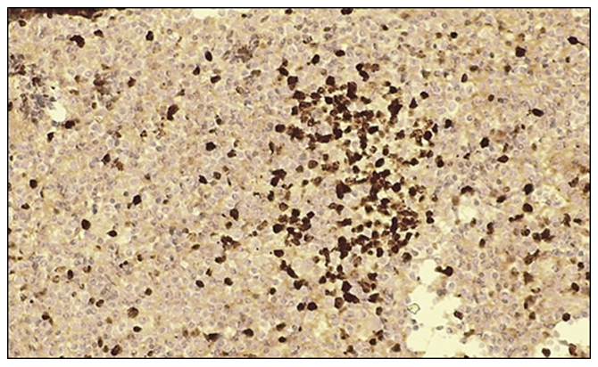 In non-small cell lung adenocarcinoma, PD-L1 expression was evaluated using the ALLRED scoring system. Among the 20 patients with lung adenocarcinoma, weak positive PD-L1 expression was observed in 4 cases (20%), moderate positive expression in 7 cases (35%), and strong positive expression in 9 cases (45%).Table 7. PD-L1 expression levels in non-small cell lung adenocarcinoma  |