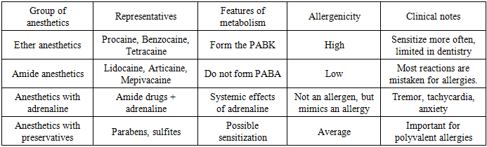 Local anesthetics play a key role in modern dental practice, ensuring the painlessness of most medical and surgical procedures. Despite their widespread use and high safety profile, these medications can cause adverse reactions, including allergic reactions, which often lead to complications during dental appointments. According to the World Allergy Organization (WAO), approximately 40% of the world's population suffers from various allergic diseases, significantly increasing the likelihood of hypersensitivity to medications, including local anesthetics [1,2].Allergic reactions to local anesthetics are considered relatively rare—true allergies occur in only 0.1–1% of patients. However, statistics from dental clinics show that the number of complaints of "allergies" significantly exceeds the actual number of cases. This is because most such episodes are not related to an allergic reaction, but to vasovagal, toxic, psychogenic, or adrenaline effects. Their similarity to the clinical picture of allergies leads to frequent overdiagnosis, unjustified withdrawal of certain medications, and complications in treatment.At the same time, even rare episodes of true allergy can have extremely severe consequences - anaphylactic shock, Quincke's edema, generalized Bronchospasm and other conditions requiring immediate medical attention. Therefore, dentists must be knowledgeable about the risk factors, typical manifestations, and diagnostic algorithms for allergic reactions to ensure maximum patient safety [3].This problem is particularly significant in outpatient dental settings, where the patient is typically not hospitalized and does not have ongoing post-procedure monitoring. In such settings, a proper allergy history, the appropriate choice of anesthetic, timely differential diagnosis, and preparedness for emergency care are crucial.In recent years, interest has grown in the development of automated systems and questionnaires for the preliminary detection of allergic conditions. Such tools allow dentists to quickly and objectively assess the risk of developing hypersensitivity, reduce appointment times, and ensure greater diagnostic accuracy. As demonstrated in a research study conducted at the Bukhara State Medical Institute, the implementation of an automated algorithm for collecting allergy history data contributes to improved safety of dental procedures and a reduced incidence of complications [4,5].Thus, studying the clinical characteristics of allergic reactions to local anesthetics, their actual frequency, and risk factors is a pressing issue in modern dentistry. This article aims to systematize current data on this issue and analyze the possibilities for optimizing diagnostics in dental outpatient settings.Classification of local anesthetics and clinical features of allergic reactionsLocal anesthetics play a key role in dental practice, providing effective pain relief during medical and surgical procedures. However, despite their widespread use and high safety profile, adverse reactions sometimes occur in dental clinics, which patients mistakenly interpret as allergic reactions. To properly assess the risk and guide clinical management, physicians must understand the classification of anesthetics, the mechanisms of hypersensitivity, and the true clinical presentation of allergic reactions.According to modern pharmacological classification, local anesthetics are divided into two main groups— ester and amide —which differ in chemical structure, metabolism, and allergenicity. Ester anesthetics (procaine, benzocaine, tetracaine) are metabolized to form para-aminobenzoic acid (PABA), which has a high sensitizing potential, which explains their relatively high allergenicity. In contrast, amide anesthetics (lidocaine, articaine, mepivacaine, bupivacaine) have a favorable safety profile and rarely cause true allergic reactions, which is why they are used as the drugs of choice in modern dentistry.To clearly present the characteristics of various groups of anesthetics, their metabolism and allergenicity, the classification is given in the table:Table 1. Classification of local anesthetics and their allergenicity  |