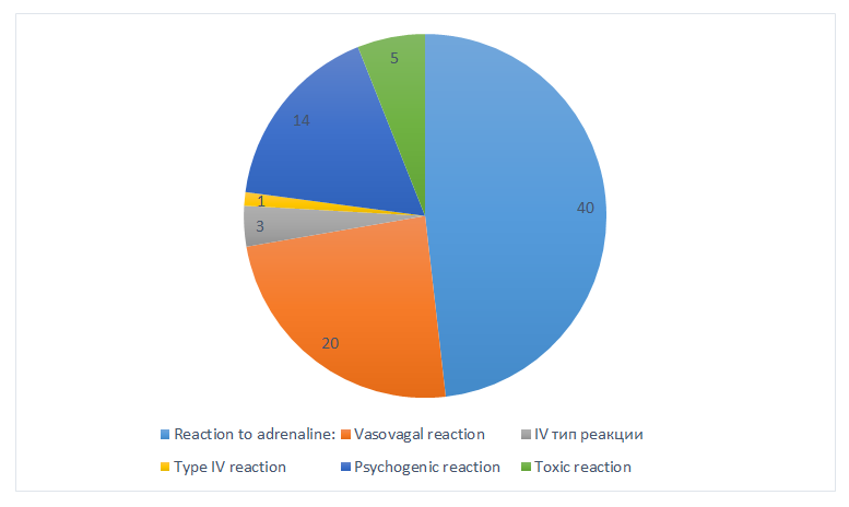 Although ether anesthetics have historically been more likely to cause allergic reactions, in modern practice, the vast majority of dental complications are not related to true allergies, but to other conditions that superficially resemble hypersensitivity. However, to properly differentiate, it is necessary to understand the manifestations of a true allergy. | Figure 1. Actual distribution of reactions mistaken for "allergy to anesthetic" (%) |