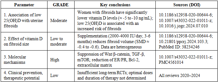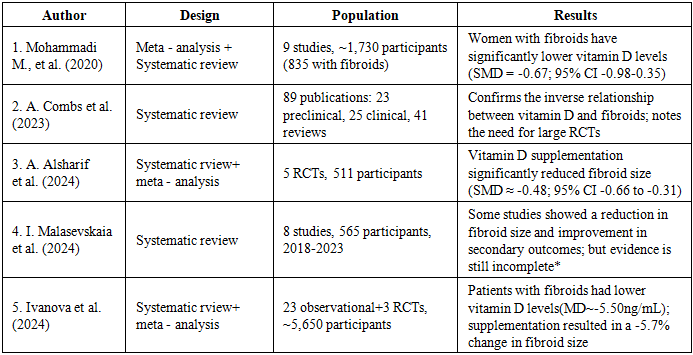 | [33] | M. Ivanova et al. “The association of vitamin D with uterine fibroids in premenopausal patients: a systematic review and meta-analysis”. PubMed, 2024. PMID: 39128544. |