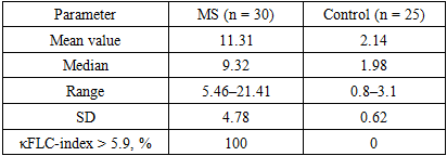 Analysis of the κFLC-index revealed pronounced differences between patients with multiple sclerosis and the control group. In all patients with MS, κFLC-index values exceeded the diagnostic threshold, whereas no pathological values were recorded in the control group.Table 1. κFLC-index in patients with multiple sclerosis and in the control group  |