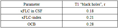 In the main group, concentrations of κ-free light chains in cerebrospinal fluid were significantly higher compared with the control group. The median value in patients with multiple sclerosis was 12.8 mg/L, whereas in individuals without demyelinating pathology this parameter did not exceed 1.9 mg/L. The observed differences were statistically significant (p < 0.001).Oligoclonal immunoglobulin bands in cerebrospinal fluid were detected in 87% of patients with multiple sclerosis. Their presence was accompanied by higher values of κ-free light chains and κFLC-index, reflecting the severity of the intrathecal immune response.ROC analysis showed that the κFLC-index had higher diagnostic accuracy compared with absolute values of κ-free light chains. Method sensitivity ranged from 0.90 to 0.95, and specificity from 0.85 to 0.90.Correlation analysis revealed moderate positive associations between κFLC-index and chronic MRI signs of white matter damage, including T1 hypointense lesions (“black holes”). At the same time, absolute values of κ-free light chains in cerebrospinal fluid demonstrated weaker correlations.Table 2. Correlation of immunological markers with chronic MRI changes  |