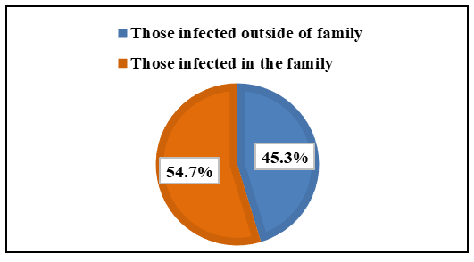In the scientific research process, epidemiological, clinical (retrospective epidemiological analysis), bacterioscopic studies, and statistical (Pearson's chi-square (χ2) coefficient, variation analysis, and Fisher's method) research methods were used.We aimed to study the influence of family clusters, internal and external migration on the spread of scabies. When we examined 464 patients under our observation for the presence of familial clusters, it was determined that 254 (54.7%) patients had contracted the disease from one of their family members (Figure 1).Mites are active at night and transmission occurs more frequently during nighttime. | Figure 1. Distribution of family and non-family transmission among 464 patients diagnosed and treated for scabies |