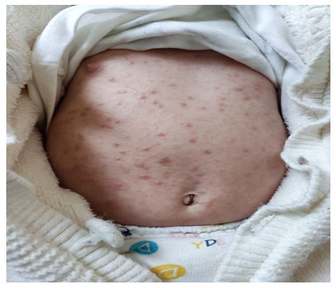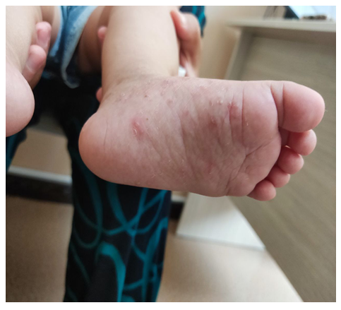 Especially in infants aged 1-2 years, scabies mites are transmitted directly from the mother. In the typical form of scabies, the skin on both hands of the affected mother is primarily affected. Numerous nodules, vesicles, and mite burrows are located between the fingers of her hands. Additionally, rashes appear on the skin of mothers' breasts and genital area. Naturally, scabies is transmitted from such a mother during childcare. Over a period of 7-15 days, numerous small nodules and blisters appear on the baby's skin (Figures 2, 3, 4, 5). The skin of the inflamed areas becomes red, with excessive scaling at the edges. As we all know, infants cannot speak. Therefore, itching, the most important subjective symptom of scabies, remains unknown to the doctor. Young specialists may confuse it with allergic dermatitis, toxicoderma, atopic dermatitis, and other diseases characterized by similar rashes. Only the correct collection of epidemiological history, careful attention to the characteristics of objective rashes, medical examination of family members, and laboratory tests will contribute to the accuracy of the diagnosis. | Figure 2. Clinical presentation of scabies on the skin of a 3-month-old baby |