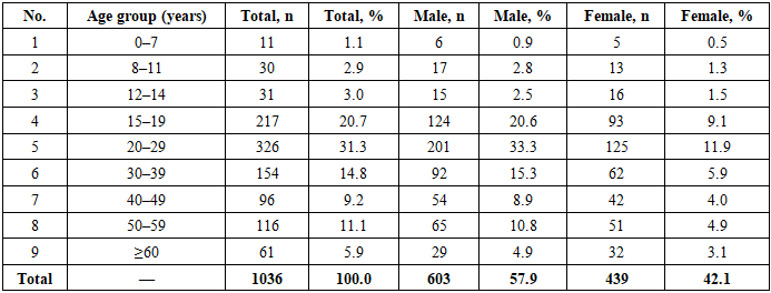 Between 1931 and 2006, a total of 1,036 patients with leprosy were hospitalized at the Samarkand Leprosarium. The highest numbers of admissions were recorded during 1951–1960 (319 cases), followed by 1941–1950 (238 cases) and 1931–1940 (229 cases).More than half of all patients (554; 53.1%) were migrants from other regions of the former Soviet Union or foreign countries. Among them, 34.1% originated from the Russian Federation, 12.8% from Kazakhstan, 7.5% from Tajikistan, and 31.0% from the Republic of Karakalpakstan. Patients from Turkey, Iran, China, Laos, and Japan were also identified.During 1931–1960, imported cases exceeded locally detected cases by approximately 1.5 times, and during 1941–1950 by nearly three times. Many migrants did not return to their regions of origin after treatment and subsequently integrated into local communities, contributing to the formation of secondary disease foci.Age analysis showed that the highest incidence occurred in the 15–19 year (20.7%) and 20–29 year (31.3%) age groups. Children under 14 years accounted for 7.0% of cases, with 72.2% of pediatric patients being migrants from endemic areas.Male patients predominated (57.9%), while females accounted for 42.1%. Gender differences were minimal in childhood but increased significantly in adulthood.Table 1. Age and sex distribution of leprosy patients treated at the Samarkand Leprosarium (1931–2006)  |