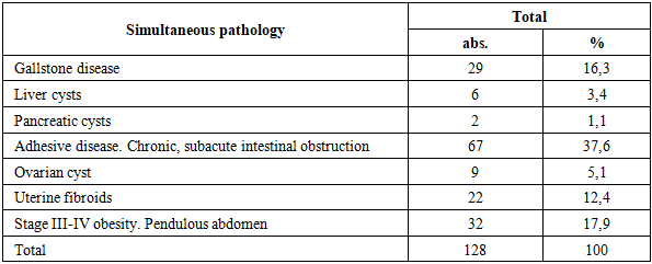 The study included 156 patients with morbid obesity and ventral hernias, who were treated in the surgical department of a multidisciplinary hospital. Patients were selected based on clinical and instrumental examinations, taking into account the degree of obesity, the size and location of the hernia defect, and the presence of concomitant surgical pathology of the abdominal cavity and pelvis. All patients underwent elective surgery after standard preoperative preparation.Depending on the chosen surgical approach, patients were divided into two comparable groups. The comparison group (n=54) included patients who underwent isolated hernialloplasty using tension-free methods of anterior abdominal wall reconstruction. The main group consisted of 102 patients who underwent a combined surgical approach, including hernioalloplasty, abdominoplasty and simultaneous correction of concomitant surgical pathology of the abdominal and pelvic organs.Table 1. Structure of concomitant surgical diseases of the abdominal organs in patients of the main group  |