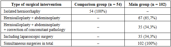 Patients were assigned to groups based on their clinical presentation, the severity of abdominoptosis, the volume of the skin-fat apron, and the nature of any comorbidities. Patients in the study group underwent simultaneous procedures aimed at comprehensively addressing the hernia defect and any factors that could adversely affect hernioplasty results [5]. The sequence and scope of surgical procedures were determined individually, depending on the anatomical and functional characteristics and any comorbidities identified.Table 2. Types of surgical interventions performed in patients with ventral hernias and morbid obesity  |