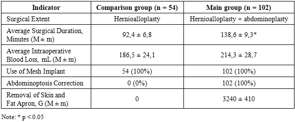 All patients underwent a comprehensive clinical and instrumental examination, including anamnesis, physical examination, and laboratory and instrumental testing. Particular attention was paid to assessing the degree of obesity, the severity of abdominoptosis, the size and location of the ventral hernia, and the identification of concomitant surgical pathology of the abdominal and pelvic organs. The duration of the surgical procedure and the volume of intraoperative blood loss were recorded intraoperatively.Table 3. Comparative characteristics of surgical interventions in the study groups  |