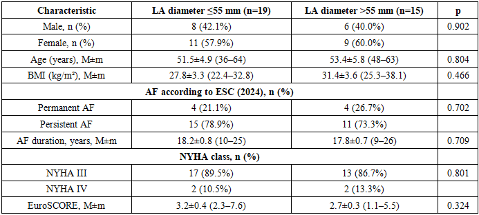Comparative characteristics of the groups depending on the baseline left atrial diameter.To assess the prognostic significance of left atrial (LA) size with respect to the risk of atrial fibrillation (AF) recurrence after surgical intervention, a comparative analysis was performed in patients divided into two groups according to baseline LA diameter: ≤55 mm (n = 19) and >55 mm (n = 15).Comparative analysis of clinical and demographic characteristics showed that the groups were comparable in terms of sex, age, body mass index, AF form and duration, NYHA functional class of heart failure, and integrated operative risk assessed by the EuroSCORE system (p > 0.05). This indicates the homogeneity of the study groups and allows the observed postoperative differences to be considered as predominantly related to baseline LA size.Table 1. Demographic and clinical characteristics of patients depending on left atrial size  |