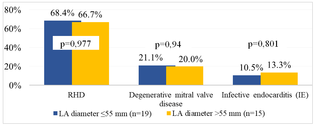 The primary diagnoses were also analyzed in patients with LA diameters ≤55 mm and >55 mm. In both groups, the predominant underlying disease was chronic rheumatic heart disease, observed in 68.4% and 66.7% of patients, respectively (p = 0.977). Degenerative mitral valve disease was present in 21.1% of patients with LA ≤55 mm and in 20.0% of those with LA >55 mm (p = 0.940). Infective endocarditis was diagnosed in 10.5% and 13.3% of patients, respectively (p = 0.801). No statistically significant differences between the groups were identified (Fig. 1). | Figure 1. Primary diagnosis in patients of the study groups depending on left atrial (LA) size |