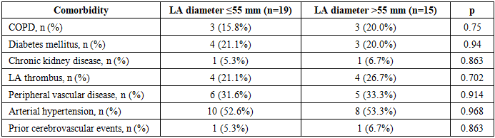 Analysis of the etiology of mitral valve pathology revealed no statistically significant differences between the groups. In both groups, chronic rheumatic heart disease predominated, while the proportions of degenerative mitral valve disease and infective endocarditis were comparable (p > 0.05). Similarly, the prevalence of comorbid conditions—including chronic obstructive pulmonary disease, diabetes mellitus, chronic kidney disease, arterial hypertension, left atrial thrombosis, peripheral vascular disease, and a history of cerebrovascular events—did not differ between the groups (p > 0.05).Table 2. Comorbidities in patients of the study groups depending on LA size  |