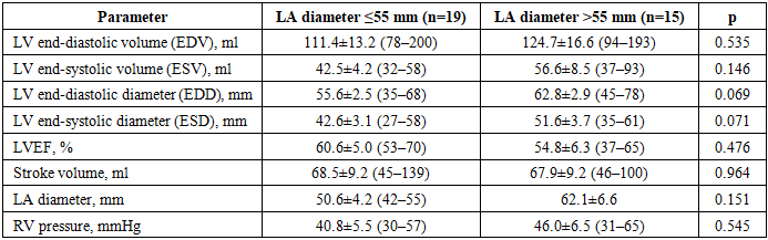 Preoperative echocardiographic parametersBaseline echocardiographic parameters—including left ventricular end-diastolic and end-systolic volumes and dimensions, left ventricular ejection fraction (LVEF), stroke volume, right ventricular pressure, and mitral valve indices—were comparable between the two groups (p > 0.05). Despite the expectedly larger absolute LA diameter in the second group, no statistically significant differences were observed at the preoperative stage, underscoring the clinical comparability of the groups at baseline.Table 3. Echocardiographic parameters in patients of the study groups depending on LA size  |