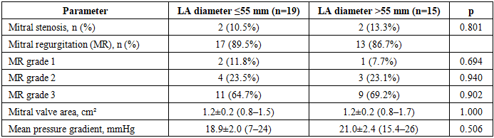Mitral stenosis was detected with similar frequency (10.5% vs 13.3%; p = 0.801), while grade 3 mitral regurgitation predominated (64.7% vs 69.2%; p = 0.902). The mean mitral valve orifice area and the mean transvalvular pressure gradient also did not differ significantly between the groups (p > 0.05) (Table 4).Table 4. Mitral valve assessment in patients of the study groups depending on LA size  |
