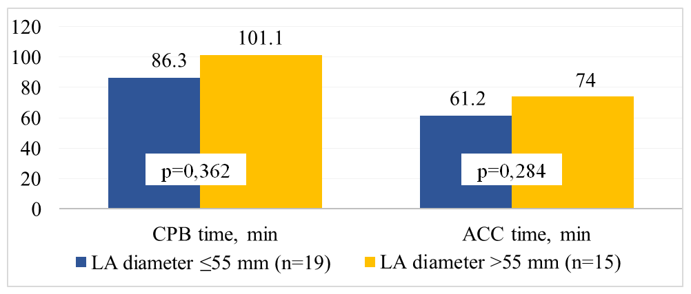 Operative characteristics and postoperative courseAnalysis of intraoperative parameters showed no differences between the groups in cardiopulmonary bypass duration or aortic cross-clamp time (p > 0.05). However, the need for inotropic and/or vasopressor support was significantly higher in patients with a baseline LA diameter >55 mm compared with those with LA ≤55 mm (33.3% vs 5.3%; p = 0.034), indicating greater intraoperative hemodynamic instability in patients with enlarged LA. | Figure 2. Comparison of operative characteristics in patients of the study groups depending on left atrial (LA) size |