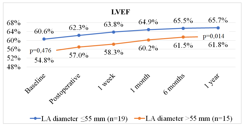 The duration of mechanical ventilation, length of stay in the intensive care unit, and total postoperative hospital stay were comparable between the two groups (p > 0.05). The incidence of postoperative complications was low, and no statistically significant differences were observed between the groups.Dynamics of cardiac remodeling parametersIn the postoperative period, significant differences were identified in the dynamics of structural and functional cardiac parameters. Patients with a baseline LA diameter ≤55 mm demonstrated a significantly more pronounced and sustained improvement in left ventricular systolic function. As early as the immediate postoperative period, left ventricular ejection fraction (LVEF) was statistically significantly higher in this group, and these differences persisted at all follow-up time points—1 week, 1 month, 6 months, and 1 year after surgery (p < 0.05 at all stages). | Figure 3. Comparative analysis of changes in left ventricular ejection fraction (LVEF) dynamics depending on baseline left atrial (LA) size |