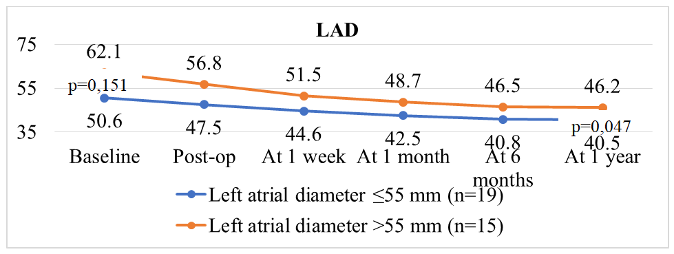 Analysis of LA size dynamics demonstrated that both groups exhibited a trend toward reverse atrial remodeling with a gradual reduction in LA diameter. However, at all postoperative follow-up time points, the LA diameter remained significantly smaller in patients with a baseline LA size ≤55 mm (p < 0.05). Moreover, the degree of LA reduction was more pronounced in this group compared with patients whose baseline LA diameter exceeded 55 mm. | Figure 4. Comparative analysis of changes in left atrial (LA) diameter dynamics depending on baseline LA size |