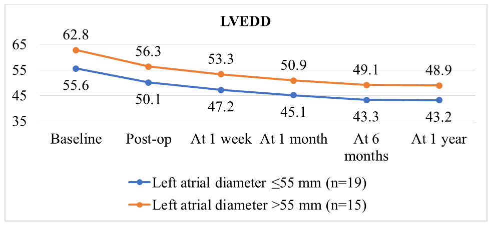 A similar pattern was observed in the analysis of left ventricular end-diastolic diameter (LVEDD). At all postoperative follow-up stages, LVEDD was significantly smaller in patients with a smaller baseline LA diameter (p < 0.05), reflecting a more favorable course of reverse remodeling processes. | Figure 5. Comparative analysis of left ventricular end-diastolic diameter (LVEDD) dynamics depending on baseline left atrial (LA) size |