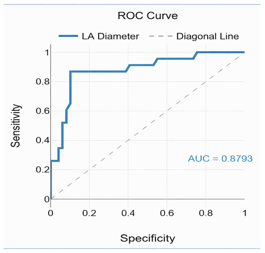 Prognostic significance of left atrial diameterTo evaluate the prognostic value of LA diameter regarding the risk of atrial fibrillation (AF) recurrence, a ROC analysis was performed. The results demonstrated high diagnostic and prognostic significance of this parameter. The area under the ROC curve (AUC) was 0.879, indicating high accuracy of the model. A threshold LA diameter >55 mm was associated with a sensitivity of 86.7% and a specificity of 89.8% for predicting AF recurrence after surgical treatment. | Figure 6. ROC analysis: left atrial (LA) diameter as a prognostic factor for AF recurrence after surgical treatment in patients with mitral valve disease and atrial fibrillation |