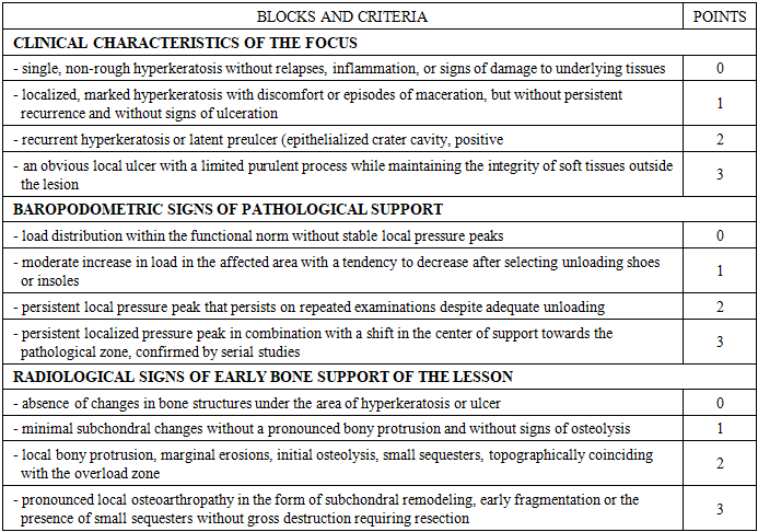 The results of the multivariate logistic analysis allowed us to quantify the contribution of each parameter to the need for local bone-unloading correction and use these data to construct a comprehensive assessment scale for local overload and bone support of the "COLP" lesion. The scale is organized into three sections, reflecting clinical manifestations, baropodometric characteristics of foot support, and radiographic signs of early bone structure and configuration changes. Each block includes four levels of symptom severity, assigned a score from 0 to 3. This approach ensures a sequential transition from minimal to severe changes, covering the full spectrum of conditions identified in the control group (Table 1). The first block captures the clinical features of the lesion and begins with mild hyperkeratosis, which is assigned a score of 0 as a condition without signs of structural instability. Increasing hyperkeratosis severity, the appearance of discomfort, and episodes of maceration correspond to a score of 1. The most important category within the clinical block is the combination of recurrent hyperkeratosis and an epithelialized subepithelial cavity, reflecting the presence of a latent preulcer; this condition is assigned a score of 2.Table 1. COLP diagnostic scale for hyperkeratosis of the foot in patients with diabetes  |